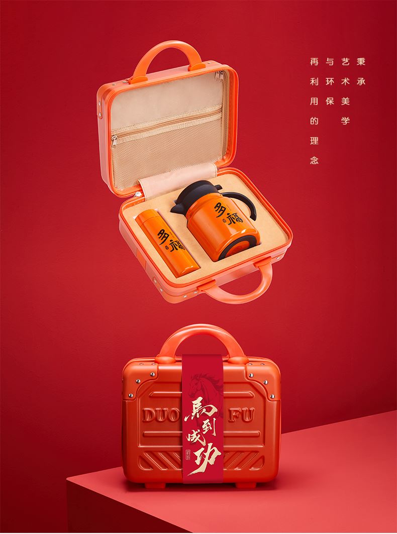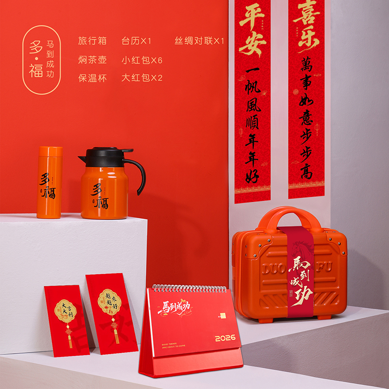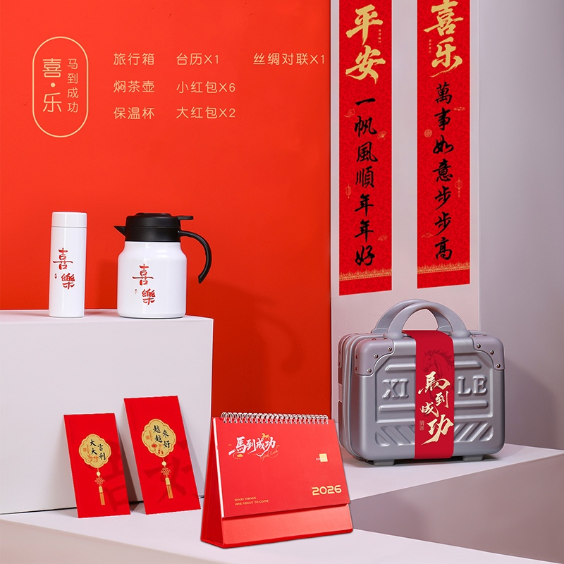 1.多福【馬到成功】:產(chǎn)品清單:旅行箱、保溫杯、燜茶壺、臺歷*1、小紅包*6、大紅包*2、絲綢對聯(lián)*1 2.喜樂【馬到成功】:產(chǎn)品清單:旅行箱、保溫杯、燜茶壺、臺歷*1、小紅包*6、大紅包*2、絲綢對聯(lián)*1